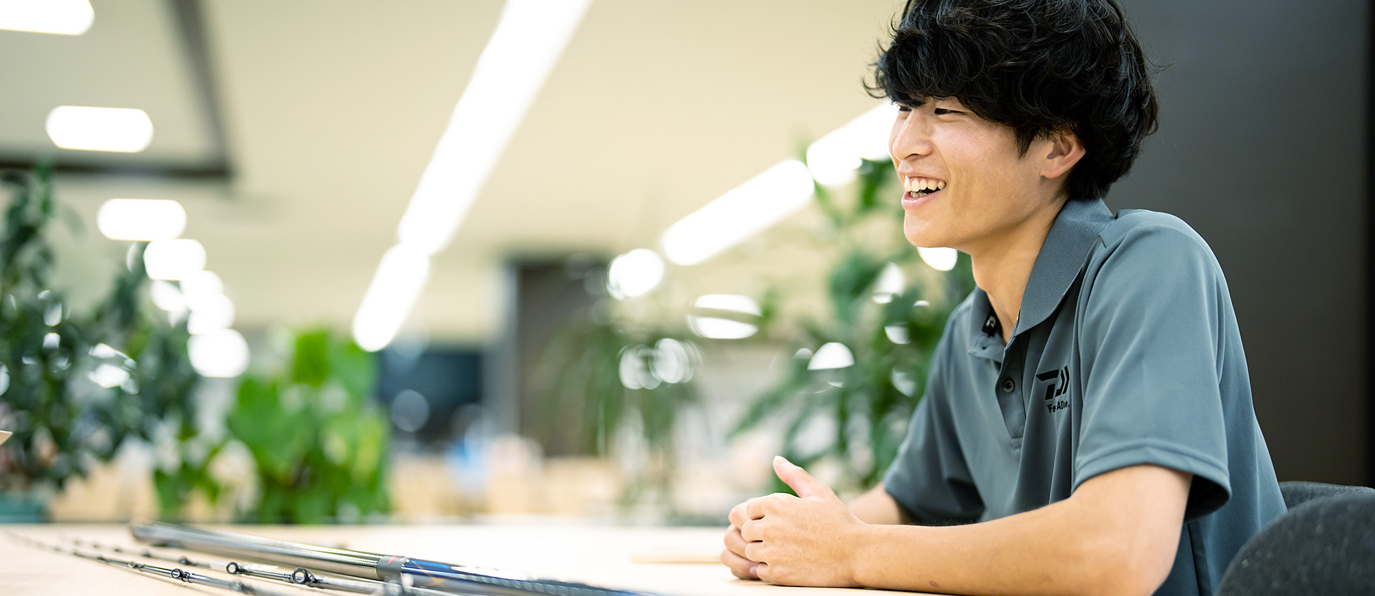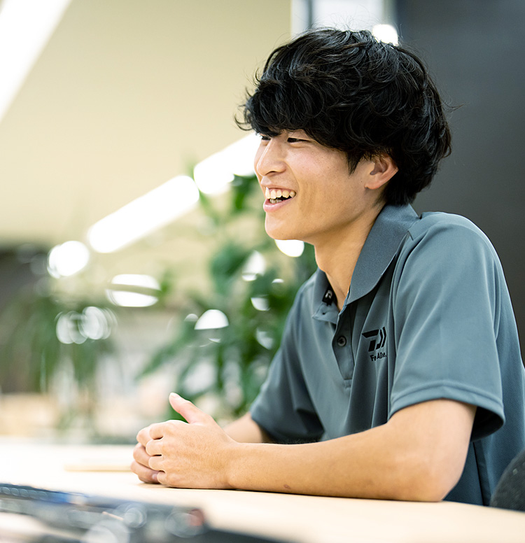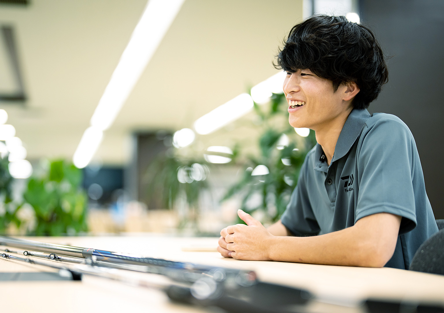 私は高等専門学校で学んでいました。いよいよ進路を決定する際、学校から釣具のダイワの製造販売を主要事業とするグローブライド社への求人票があったんです。小学生の頃から釣りが好きだったこともあり、迷うことなく応募することを決めました。就職する前、実はグローブライドの釣具工場を見学する機会がありました。私自身の頭の中では「ベルトコンベアに組立中の釣具が乗って、流れるように半自動で組立作業をしているのかなぁ…」と想像していたのですが、その様子は全く違い、正直驚きました。工程ごとに異なる作業がなされ、工場で働く方々お一人おひとりが職人のように緻密な作業をされていたのです。その様子を見て、改めてモノづくりの奥深さを感じました。高等専門学校ではシステムの設計や開発について学んでいたので、入社後はその知識を活かし会社の成長に貢献できるだろうイメージを抱いていたこともあり、製造部配属を希望しました。