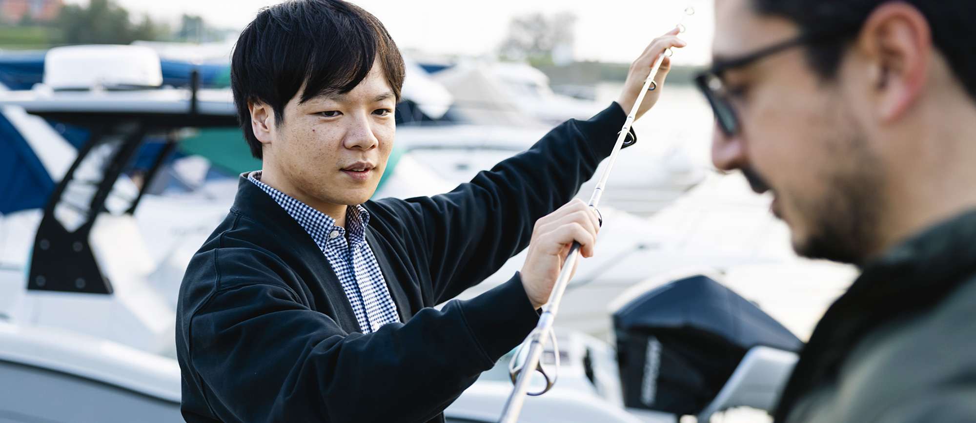 グローブライドに入社後5年間は大阪営業所でフィッシング営業部の一員としてセールス業務を担ってきました。2021年から本社へ異動となり海外販売会社をサポートする部署に勤務し、2023年からヨーロッパの販売拠点の一つであるダイワ・イタリアS.r.lに着任しました。ダイワ・イタリアS.r.lでは、社長と私の日本人スタッフ2名と現地のイタリア人スタッフが勤務しています。